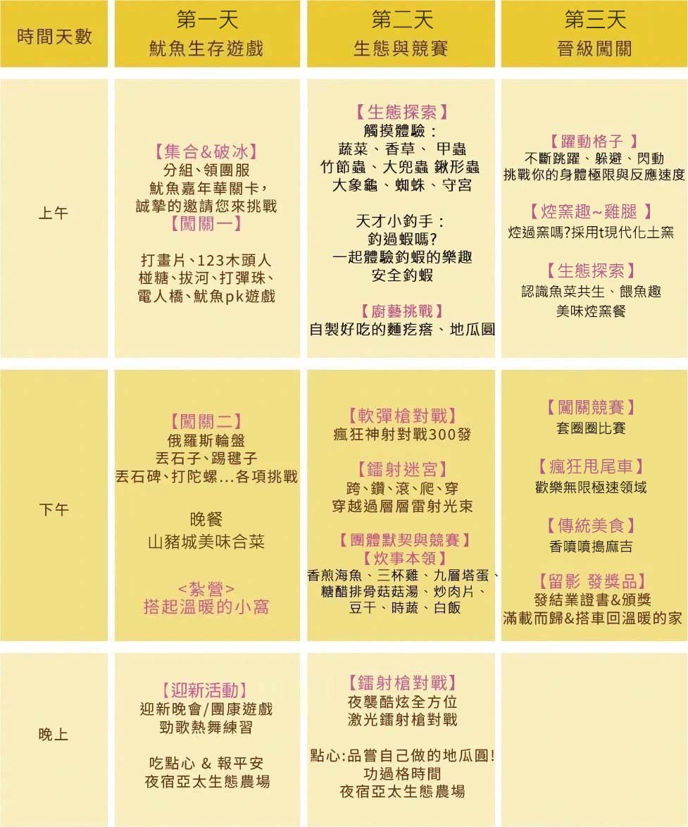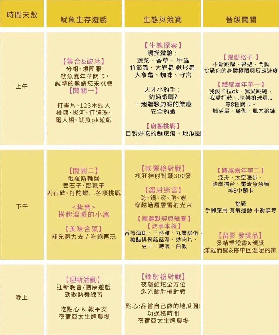 魷魚生存遊戲 : 喜歡Netflix推出的韓國原創影集”魷魚遊戲”嗎?魷魚嘉年華關卡,誠摯的邀請您來挑戰,讓您不需賭命也能參加!躍動格子: 全新運動互動體驗: 結合智能設備、反應力和團隊協作!在這裡,你將站在閃動的格子平台上,不斷跳躍、躲避、閃動,挑戰你的身體極限與反應速度。當格子開始閃動時,你必須在最快時間內判斷並踩中代表「安全」的藍色格子!同時要小心,別踩到代表「危險」的紅色格子,它們會讓你失掉生命值!歡樂體感嘉年華:「體感嘉年華」是一系列趣味的闖關挑戰賽,總共有16款競賽項目。各項挑戰關卡內容有肺活量、瑜伽、肌肉鍛鍊、手腳應用,有氧運動、平衡感等多樣化內容, 且可調整難易度,考驗著玩家「體能」與「智力」【技術應用】: 3DMAX、Arduino、APP程式編寫、RFID、藍牙、磁力感測、無線射頻、三軸、壓力、拉力、紅外線感測等。 自然生態與各項體能活動生態探索 : 認識常見蔬菜及香草物 ;都是真的哦~看的到也摸的到!和赫克力士大兜蟲、長頸鹿鋸鍬形蟲、竹節蟲、蜘蛛、守宮、大象龜…拍拍照。野炊, 烤肉, 焢窯樂 : 學習自理能力的一個機會,知道媽媽平常做飯也不容易啊!野炊營養食材: 香煎海魚、三杯雞、九層塔蛋、糖醋排骨、菇菇湯、炒肉片、豆干、時蔬、白飯烤肉新鮮食材: 魚、岩燒豬里肌肉、天婦羅、鮮烤時蔬、鮮甜玉米、吐司1條、養生鮮菇、五香豆干、特級香腸、雞腿片、福懋貢丸軟彈槍對戰pk 賽: 新式射擊遊戲,有漆彈的震撼又不用擔心被擊中會黑青!讓你體驗原始作戰的樂趣!漆彈定點靶射擊 : 具挑戰又安全性極高的健康休閒活動鐳射迷宮挑戰賽 : 跨、鑽、滾、爬,穿過層層的鐳射光束與隊友觀察出最佳通過路線及方式,達成教練指定的任務。夜間鐳射槍對抗 : 夜襲酷炫全方位、激光鐳射槍對戰極速領域賽車手: 每個人都有瘋狂甩尾的賽車魂!鬥智又鬥膽~比一比看看誰是最佳賽車手~美食紀念品DIY: 自製麵疙瘩、地瓜圓、搗麻吉、擂茶 &創作甲蟲造型存錢筒熱鬧的營火晚會: 由領隊營造氛圍帶領,拜火營火舞團康趣味競賽絕對可以讓小朋友留下深刻的印象。